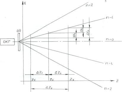 2. Определите длину волны λ лазерного излучения. В работе λ измеряется дифракционным методом. Для этого перпендикулярно лазерному лучу устанавливается дифракционная решетка. После нее луч расщепляется на ряд веерообразных расходящихся лучей (смотрите рисунок 2), которые можно наблюдать в виде удаленных друг от друга по прямой линии световых пятен на листе бумаги, помещенном за дифракционной решеткой. Самое яркое центральное пятно соответствует основному, не отклоненному лучу и называется максимумом нулевого порядка (n = 0). Яркость боковых максимумов более высокого порядка (n =1;2;3…) монотонно падает при удалении их от основного пятна.