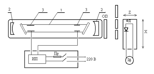 Основным элементом генератора является газоразрядная трубка 1, размещенная в оптическом резонаторе между двух сферических зеркал 2. Оптические оси газоразрядной трубки и зеркал совмещены с высокой точностью, что обеспечивает многократное прохождение оптического луча через активную среду, в качестве которой в данной работе выступает газоразрядная плазма. Выходные окна газоразрядной трубки устанавливаются либо перпендикулярно к оси трубки, либо под углом Брюстера. В одной установке используется газоразрядная трубка с перпендикулярными выходными окнами (торцами), при этом условия прохождения колебаний для всех видов поляризаций одинаковы, в резонаторе излучение оказывается неполяризованным (лазер ЛГИ-207А). В другой установке используется газоразрядная трубка с выходными окнами, выполненными под углом Брюстера, что обеспечивает прохождение колебаний только определенной поляризации и, как следствие, формируется плоскополяризованное излучение. В качестве активной среды используется смесь атомарных газов гелия He и неона Ne, общее давление которой составляет примерно 1 мм рт. ст. Отношение парциальных давлений гелия He и неона Ne обычно составляет величину 5…15. Энергетическая накачка газовой смеси осуществляется посредством электрического тлеющего разряда на постоянном токе. Для этого внутри газоразрядной трубки смонтированы два полых цилиндрических электрода 3, соединенные с источником питания ИП. При подаче на электроды трубки рабочего напряжения между электродами создается статическое электрическое поле. Эмитированные с поверхности катода электроны увлекаются этим электрическим полем и движутся к аноду, сталкиваясь на своем пути с атомами гелия и неона, при этом электрон-атомные и атомные взаимодействия (столкновения) могут быть различными: