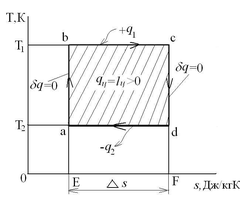 Для теплового двигателя цикл Карно – прямой цикл, состоящий из двух адиабат и двух изотерм, а для тепловых трансформаторов используется обратный цикл Карно. Тепловые машины, работающие по циклу Карно, имеют наибольшие значения термических кпд по сравнению с любым другим циклом при одинаковых предельных температурах цикла Т1 и Т2.