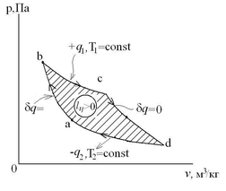 Циклы тепловых двигателей – прямые циклы, требующие для своего осуществления затраты теплоты. В них линия расширения лежит выше линии сжатия в p-v координатах, т.е. прямые циклы направлены по часовой стрелке, как показано на рисунке