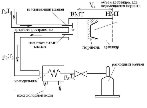 (3000C) из-за опасности возгорания масла и наличием вредного (мертвого) пространства между поршнем компрессора и днищем цилиндра из-за размещения в нем клапанов (всасывающего и нагнетательного), что учитывается объемным кпд компрессора