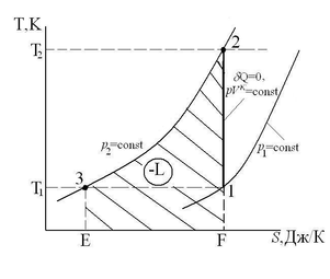 На диаграмме T-s работа, затрачиваемая на привод компрессора равна площади F23EF.
