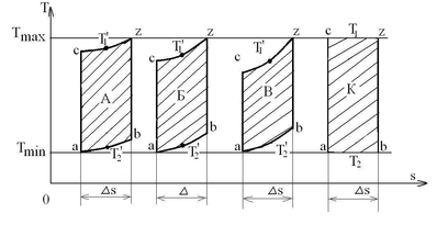 . Сравнение термических кпд различных эквивалентных циклов Карно между собой проводится при одинаковых предельных температурах:T1=Tmax и T2=Tmin. Сравним эквивалентные циклы А, Б, В с К- циклом Карно: