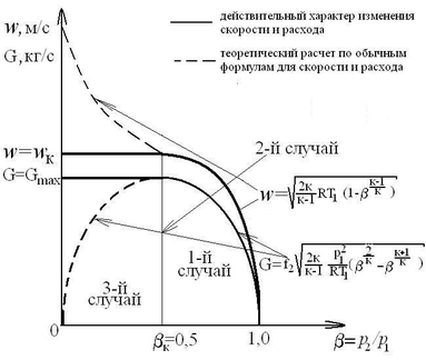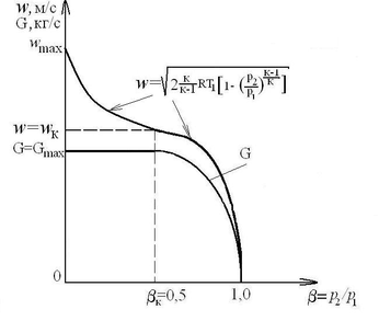 В этом случае сопло работает на полной своей производительности и при дальнейшем понижении давления р2 скорость истечения и расход газа не будут изменяться (W=Wк, G=Gmax).