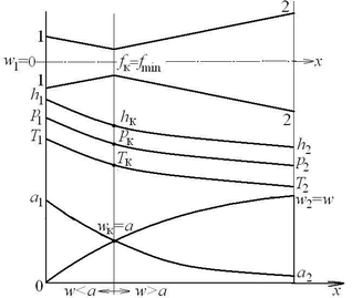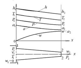 На этом рисунке показан характер изменения параметров потока газа вдоль сопла. При этом изменение энтальпии газа преобразуется в кинетическую энергию потока: