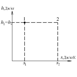 Таким образом, процесс дросселирования газа 1-2 является изоэнтальпийным (h=const), как показано на следующем рисунке: