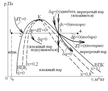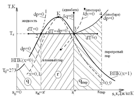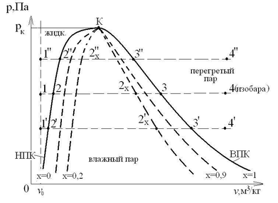 НПК – нижняя (левая) пограничная кривая (х=0) отражает состояние горячей воды при температуре насыщения t=ts=tкип.