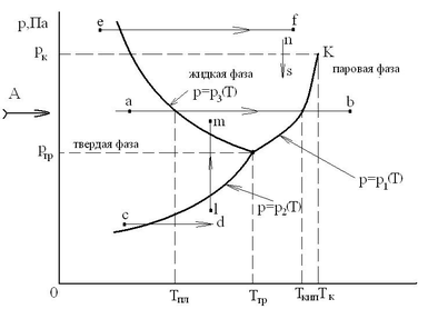 Кривые р1(Т), р2(Т) и р3(Т) разграничивают плоскость диаграммы р-Т на области, соответствующие паровой, жидкой и твердой фазам. Рассмотрим характерные процессы, представленные на р-Т диаграмме: