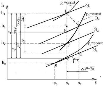 для процесса адиабатного расширения газа в сопле за полезную эксергию принимают фактическую располагаемую работу процесса «1-2» (l01-2), а в качестве затраты эксергии в процессе «1-2» принимают разность эксергий (Э1-Э2), так как эксергия уходящего рабочего тела обычно используется в последующих узлах теплосиловой установки: