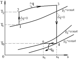 Процесс 4-0 – изотермический процесс, приводящий давление р4 к давлению р0. В процессе 4-0 теплота q0 отдается окружающей среде.