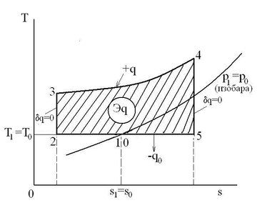 В этом цикле площадь 23452 эквивалентна работе, а собственная энергия рабочего тела на совершение работы не расходуется, так как h1=h0, s1=s0,