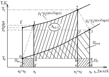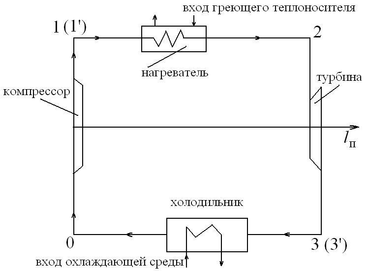 где 0-1 - процесс сжатия газа в компрессоре; 1-2 - процесс подвода теплоты; 2-3 - процесс расширения газа на турбине; 3-0 - охлаждение газа в холодильнике.