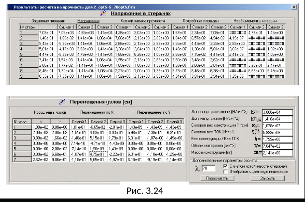 По результатам расчета конструкции 2_optS.frm (рис. 3.22) составим таблицу расчетных значений площадей поперечных сечений стержней и минимально необходимых моментов инерции.