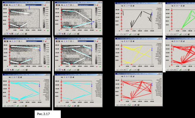 а рис. 3.18 приведены результаты совмещения построенных силовых линий для напряжений и , а также результат совмещения линий по всем напряжениям на одной картине. Самая нижняя картина – результат обработки всех этих совмещённых на одной картине линий. В данном случае был установлены 5% сходимости по координатам и углам. Дополнительный пример совмещения силовых линий приведен на рис. 54 пособия [1].