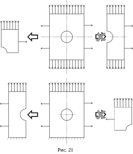 Сначала следует попытаться использовать свойства симметрии для уменьшения размерности задачи. Если пластина обладает симметрией формы и приложенной к ней нагрузки, то следует рассматривать ее половину или четверть, как показано на рис. 21.