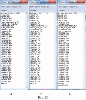 Для создания проекта надо нажать на соответствующую пиктограмму в левой части основного окна программы, задать имя проекта (например, Alfa17) в появившемся служебном окне и сохранить в отдельной папке по выбору пользователя. Открыть созданный файл можно в блокноте (рис. 23а). Как видим, файл содержит указания на все подпрограммы комплекса, которые будут задействованы в расчете. Звездочки перед именами файлов означают, что все они используются в том виде, в каком они содержатся в папке Source и никаких изменений в них не внесено. Обратите также внимание, что после последней строки, которая говорит о том, что дальше должен быть записано имя файла с геометрической моделью, ничего нет.