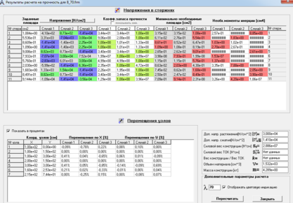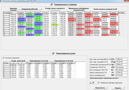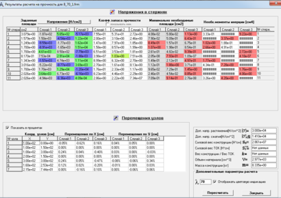 8 стержней из 11 (72%) имеют коэффициент запаса прочности больше 1.5, т.е. конструкция на 72% спроектирована нерационально, так как подобранные трубы имеют значительно большую площадь, чем необходимо. Выбор же именно этих труб обусловлен требуемыми значениями моментов инерции стержней для предотвращения их потери устойчивости.