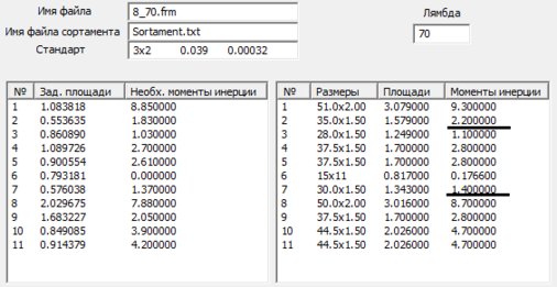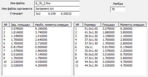 Открыв в Tube_Selector (TS) файл 8_70.frm и файл Sortament.txt (см.Б) программа Tube_Selector (TS) подберёт трубы (см.В), площади и моментов инерции которых превышают соответствующие значения площадей и моментов инерции теоретической конструкции (см. А и Б). Надо следить, чтобы характеристики в Б совпадали с характеристиками в А. Далее необходимо провести расчет конструкции из подобранных труб, что и делается внизу слева в Ferma ( см.Г). Расчет показывает, что необходимые моменты инерции стержней 2 (3.37см4) и 7 (1.77см4) (см.Г) больше момента инерции (наверху справа в TS см. В ) труб 2 (2.2см4) и 7 (1.4см4), из которых изготовлены эти стержни. Следовательно, конструкция из подобранных труб (Г=В) разрушится из-за потери устойчивости. Поэтому такую конструкцию заносим в TS (справа внизу Д) и проводим тем самым новый подбор труб (справа внизу Е). См. продолжение на след. стр.