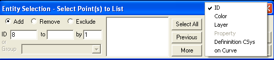 Кнопка Method позволяет поменять метод выбора объектов. До сих пор мы осуществляли выбор объекта по его ID. Если после вызова команды ListGeometryPoint нажать кнопку Method, появится список доступных методов. По умолчанию включен метод ID. Если включить, например, метод on Curve, то надпись в синей титульной линейке дополнится текстом (on Curve), а при приближении курсора к геометрическим цветом выделяться будут не точки, а линии. Щелкните по какой-нибудь линии. В окне списка выбора появляется ID именно этой линии, а не точек. Но если теперь нажать кнопку OK, то в окне сообщений появится табличка из двух строк, описывающих точки, лежащие на этой линии. Другие методы позволяют выбрать объекты по цвету (Color), по принадлежности слою (Layer), по системе координат, использованной для создания этого объекта (Definition CSys). Для объектов более сложных, чем точка появляются дополнительные возможности.