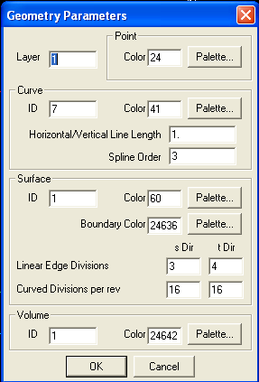 В FEMAP по умолчанию установлены цвета, которыми изображаются объекты различных типов. Например, точки изображаются желтым цветом, линии – синим, узлы – зеленым и т.д. Однако пользователю предоставлена возможность устанавливать эти цвета по своему усмотрению. В диалоговых окнах создания всех объектов есть либо кнопка Palette (палитра), либо кнопка Parameters (параметры), которая вызовет окно задания параметров, в котором есть кнопка Palette. Нажатие Palette вызовет на экран окно, позволяющее выбрать цвет.
