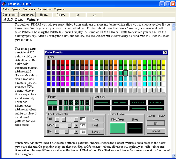 Из этой аннотации понятно, что описание диалогового бокса цветовая палитра надо искать именно в этой книге. Раскрыв оглавление книги, находим в ней подходящее название главы: FEMAP Dialog Boxes. Раскрываем содержание главы и находим в ней страницу Color Palette. Теперь двойной щелчок по этой страничке откроет ее содержание. Читайте, изучайте, тренируйтесь.