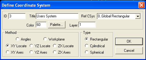 В появившемся окне отметим, что 3 – это предлагаемый номер для системы координат. Предыдущие номера уже заняты глобальными системами: 0 – декартова, 1 – цилиндрическая, 2 – сферическая. Эти глобальные системы координат ни удалить, ни изменить нельзя. В группе Type можно выбрать любой из трех возможных типов систем координат. В группе Method мы можем выбрать наиболее удобный способ задания положения и ориентации осей новой системы. Всего в вашем распоряжении 8 таких способов: