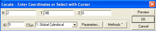 Теперь оценим, какие выгоды нам может дать использование подходящей системы координат, о чем так много говорилось в предыдущем разделе. Пусть нам надо создать точку на линии, выходящей из начала координат под углом 30 к оси X на расстоянии 2 от начала координат. К счастью, здесь не надо вычислять синусы и косинусы, а потом набирать длинные мантиссы. В списке систем координат (CSys) выберите цилиндрическую (1..Global Cylindrical). Обратите внимание, что названия координат изменились. Если вы сомневаетесь, что правильно понимаете их смысл, взгляните на рисунок в начале этой методички. Теперь указываем значение радиуса (окно R) и угла  (окно T).