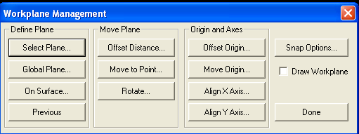 Окно управления рабочей плоскостью (Workplane Management) открывает много возможностей. Мы здесь подробно разберем метод Select Plane, а по остальным приведем краткий перечень. Желающие изучить остальные методы могут обратиться либо к HELP-у.