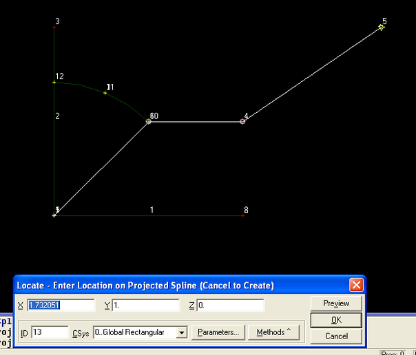 Вновь появляется такое же окно. Укажите в нем точку 6 и вновь ОК. Точки 1 и 6 соединятся прямой белой линией. Это еще не сплайн, а его черновой набросок.