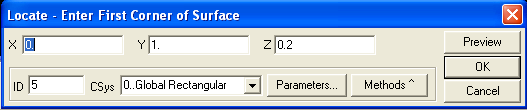 Первая группа содержит только одну команду Corners (углы). Создайте четыре точки с координатами (0,0,0), (1,0,0.2), (1,1,0), (0,1,0.2). Здесь мы впервые выходим в своих построениях за пределы плоскости XOY. Теперь вызовите команду Geometry-Surface-Corners и в появившемся окне LocateEnter First Corner of Surface (Местонахождение – Введите Первый Угол Поверхности) укажите первую из созданных точек. После нажатия OK, появится аналогичное окно с просьбой указать второй угол, затем третий и, наконец, четвертый. Указывайте в них созданные точки, обходя их против часовой стрелки.