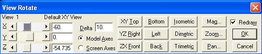 Флажок в окошке Redraw (перечертить) требует от FEMAP перечерчивать модель всякий раз, когда пользователь изменяет положение вида. Когда приходится работать с очень большой моделью, содержащей сотни и даже тысячи элементов, этот флажок полезно погасить. Иначе слишком долго придется ожидать, пока FEMAP будет перечерчивать изображение при каждом повороте осей. При отсутствии флажка в процессе работы с окном View Rotate, модель перечерчиваться не будет, а будет изменяться только изображение системы координат.