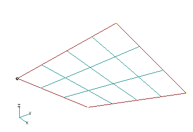 П осле последнего, четвертого OK в графическом окне появится изображение созданной поверхности и, как обычно, предложение создать еще один объект того же типа. От предложения откажемся, а с изображением ознакомимся повнимательнее. Пока что эта поверхность выглядит как квадрат. Очевидно, что поскольку точки 2 и 4 не лежат в плоскости XOY, на самом деле эта фигура сложнее, чем кажется. Прежде всего, её необходимо получше разглядеть. Сейчас мы смотрим на изображение со стороны стрелки оси Z. Из-за этого трудно понять, какие из точек поверхности ближе к наблюдателю, какие дальше и разобраться, какую форму имеет созданная поверхность, глядя на рисунок, просто невозможно. Из курса начертательной геометрии знаем, что наиболее наглядные изображения трехмерных объектов получаются при использовании аксонометрических проекций. В FEMAP имеется средство для того, чтобы изменять точку зрения на чертеж. Или, что тоже самое, поворачивать модель перед глазами наиболее удобным образом. Выполните команду View-Rotate. Это окно мы рассмотрим сейчас довольно подробно, но пока просто нажмите в нем кнопку Dimetricэто приведет к тому, что наша модель будет изображена в стандартной диметрической проекции. Расположение осей глобальной системы координат, которое всегда изображается в левом нижнем углу графического окна, изменится, а внешний вид созданной поверхности станет более понятным.