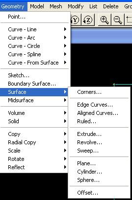 Следующий за кривыми по сложности геометрический объект – поверхность (Surface). Для создания поверхностей, как нетрудно догадаться следует использовать пункт меню Geometry-Surface. Различных способов, как видим, довольно много. Все они разбиты на пять групп.