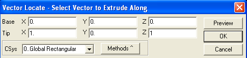 З атем выполните команду Geometry-SurfaceExtrude (выдавливать), в окне выбора линии укажите только что созданный сплайн, после чего на экране появится окно Vector LocateSelect Vector to Extrude Along (расположение вектора – выберите вектор для выдавливания вдоль). Поверхность будет образована «протаскиванием» выбранной линии в направлении заданного вектора. Вектор задается координатами его начала (Base) и конца (Tip). Задайте этот вектор, например, так как на рисунке, и, нажав ОК, вы получите эту поверхность. Выберите подходящий вид (View-Rotate), в котором эта поверхность будет выглядеть наилучшим образом: