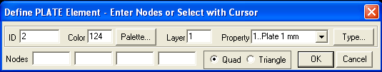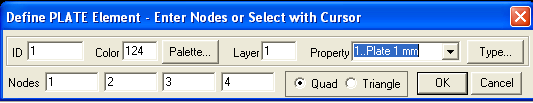 Теперь пришло время создать первый элемент. Выполните команду ModelElement (горячие клавиши Ctrl+E). На экране появляется диалоговый бокс для определения элемента пластины – Define PLATE Element.