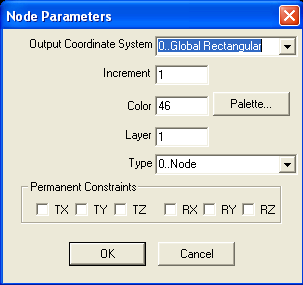 Уже при создании узла можно закрепить его. Поставив, например, флажок в окошке TX (T – translation или перемещение), вы запрещаете перемещение в направлении оси X выходной системы координат. Аналогично с помощью окошек TY, TZ вы можете запретить перемещения в направлении двух других осей. Окошки RX, RY, RZ – используются для запрета поворотов относительно соответствующих осей (R – rotation или поворот). Надо сказать, что закрепление узлов в момент их создания используется редко. Чаще закрепление производится позже, после создания всех узлов и элементов модели. Для этого используется команда ModelConstraint, которая будет рассмотрена на последующих занятиях.