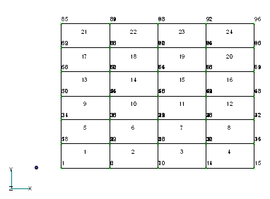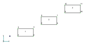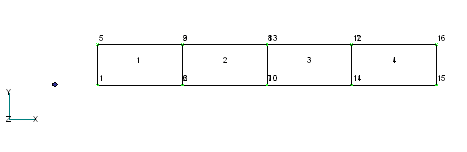 К оманда Copy довольно мощное средство. Посмотрим, как с помощью этой команды можно построить конечно-элементную сеть для прямоугольной пластины. Оставим только первый элемент, например, выполнив команду ToolsUndo. Теперь сделаем 3 копии элемента, указав для вектора копирования компоненты (20,0,0).