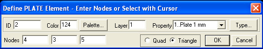 то окно, как и следовало ожидать, проще чем для элемента пластины. Во-первых, для определения элемента используется только два узла, во-вторых, отсутствуют кружки для определения элемента. Это естественно, ведь форма возможна только одна – отрезок прямой. Пусть ваш стержень будет соединять шестой и пятый узлы.