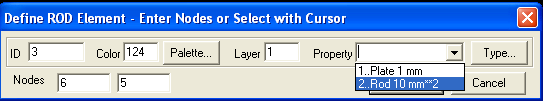 Из списка Property, естественно, надо выбрать соответствующий сортамент. Конечно тип элемента и Property, которое мы для него указываем должны быть совместимы. Однако лучше один раз увидеть. Попробуйте создать элемент типа Rod с сортаментом типа Plate и посмотрите, что из этого получится. А потом уже сделайте правильный выбор.