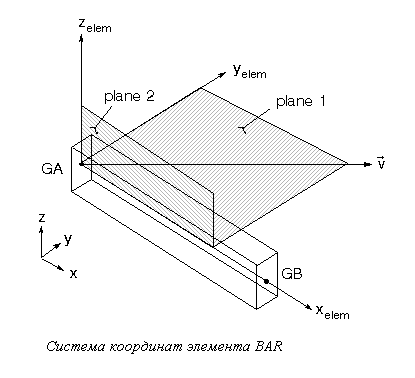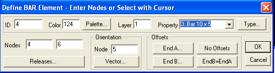 Как и следовало ожидать, это окно несколько сложнее, чем при создании элементов Rod. Окна Nodes, правда, имеют прежнее значение – в них надо указать узлы, являющиеся концами бруса. А вот новое окошко Orientation Node (узел ориентации) требует указать ориентацию сечения. Указав в этом окне узел 5, мы говорим, что плоскость 1 (см рисунок Система координат элемента Bar) лежит в плоскости определенной узлами 4, 6 и 5.
