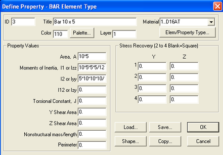 Кнопки Load, Save и Copy имеют точно такое же назначение, как и в окнах определения свойств материала. Кнопка Shape (форма) позволяет избежать ручного вычисления характеристик сечения. Нажав ее, вы получите возможность выбрать одно из часто встречающихся типовых сечений (уголок, тавр, двутавр) и задать характерные размеры этого сечения. FEMAP сам, без вашей помощи (и без ошибок) вычислит для него все площади и моменты инерции. Эта возможность здесь подробно не рассматривается. Желающие могут освоить ее самостоятельно. Это не так сложно. Окно, появляющееся при нажатии кнопки Shape довольно понятно, и в нем можно разобраться даже без помощи Help-а.
