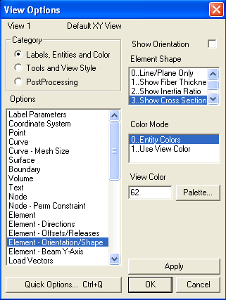 В се те вещи, изображением которых мы можем управлять, разбиты на три категории (Category). По умолчанию выбрана именно та категория, которая нам нужна сейчас – Labels, Entities and Color (метки, объекты и цвет). В списке опций (Options) указываем ElementOrientation/Shape (элемент – ориентация/ форма). Теперь в списке Element Shape выберем третий вариант – Show Cross Section (показывать поперечное сечение). Теперь можно сразу нажать кнопку OK, но лучше не торопиться, а нажать кнопку Apply (применить). В этом случае изменения во внешнем виде элементов произойдут, но окно View Options закрыто не будет. Благодаря этому можно сразу внести поправки, если эти изменения внешнего вида нас чем-то не устраивают. Например, мы можем захотеть сделать видимыми ориентационные вектора элементов и поставить флажок в окошке Show Orientation (показать ориентацию). Вновь нажмем кнопку Apply и, если полученное изображение нам понравится – кнопку OK. У нас получилась такая картина: