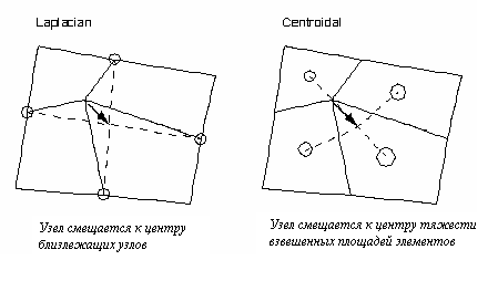 Сглаживание по Лапласу (Laplacian) смещает узел по направлению к точке, находящейся посредине близлежащих узлов непосредственно соединенных с этим узлом границами элементов. Центроидное сглаживание смещает узел по направлению к центру тяжести взвешенных площадей близлежащих элементов.