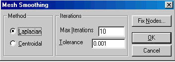Если мы желаем сглаживать сетку, которая содержит некоторые внутренние узлы, которые должны оставаться в настоящем положении, нажмите “Fix Nodes”. Мы можем затем добавить эти узлы в список узлов на границе, используя стандартный диалоговый бокс выбора объекта. Мы можем также удалить граничные узлы из списка, чтобы разрешить им перемещаться из их текущей позиции.