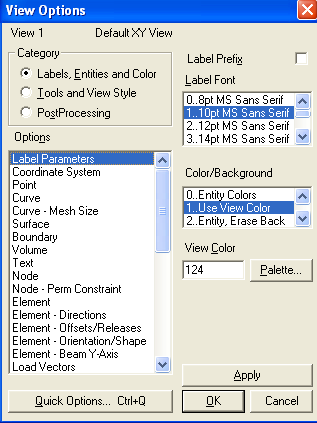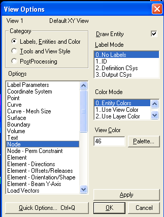 Labels, Entities and Colors – настройка изображения конечно-элементных объектов (узлов, элементов), цветов их отображения и меток (чаще всего номеров)