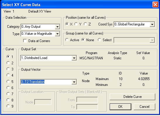 В левом нижнем углу находятся рамки Curve (кривая), Output Set (выходной набор) и Output Vector (выходной вектор). Что касается рамки Curve, то устанавливая точку в позиции 1, 2, 3, … 9 мы получаем возможность задать данные для одной из 9-ти кривых. FEMAP позволяет построить на одной эпюре до девяти кривых.
