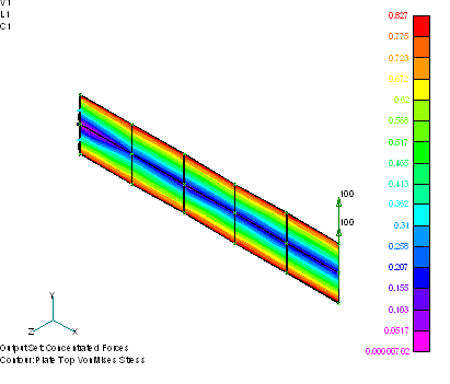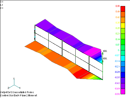 Для модели, которая была создана еще на прошлом занятии, попрактикуйтесь в использовании различных стилей Deformed и Contour. Вам надо уметь понимать и объяснять изображения, создаваемые каждым из этих стилей. Некоторые из стилей окажутся для этой модели недоступными. Вам надо понять, почему и суметь объяснить это преподавателю. Здесь для примера приведены изображения распределения напряжений Ван Мизеса в элементах Plate и эпюры изгибающих моментов в стержневых элементах.