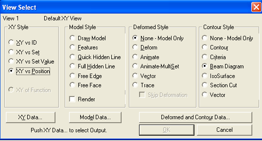 Мы с вами сейчас выберем вариант vs Position – наиболее знакомый еще по сопромату вариант создания графиков, в которых по горизонтальной оси откладывается координата. После этого мы обязаны указать FEMAP’у, какие данные нужно показать на эпюре. Для этого нажимаем кнопку XY Data.