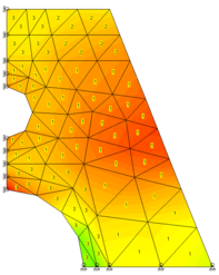 В нижней части пластины синей линией обозначена теоретическая граница раздела свойств КЭ. Хорошо видно, что узлы, образующие изначальную границу, остались на своих местах, но вследствие образования новых КЭ (справа от границы) стороны КЭ изменили свое положение. Если внимательно присмотреться, то можно понять, почему так случилось. Если бы грань осталась на своем месте, то вместе двух остроугольных треугольников было бы два тупоугольных. Так работает метод смены диагонали. Он отыскивает все 4-х угольники и если смена диагонали приводит к улучшению характеристик каждого из треугольников, образуемых этой диагональю, то он меняет эту диагональ.