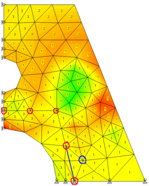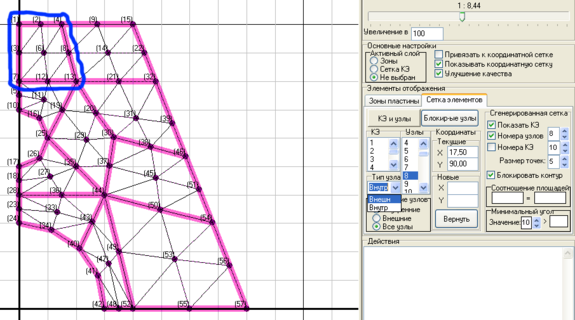 Например, область, обозначенная синим цветом, имеет свойство КЭ, отличное от свойств соседних КЭ. Чтобы заблокировать узлы, образующие эту область, надо их номера найти в списке узлов и назначить им тип узла – «внешний».